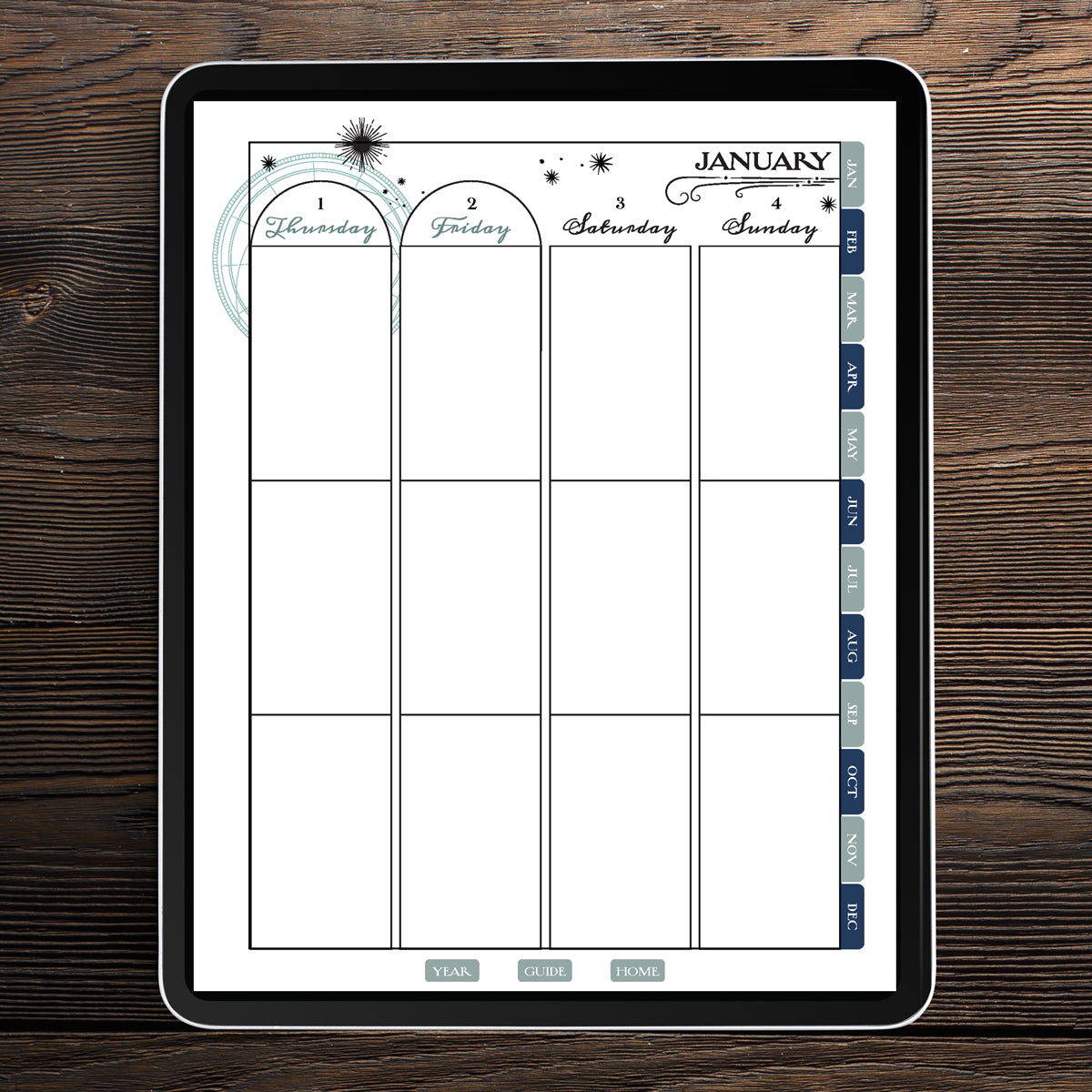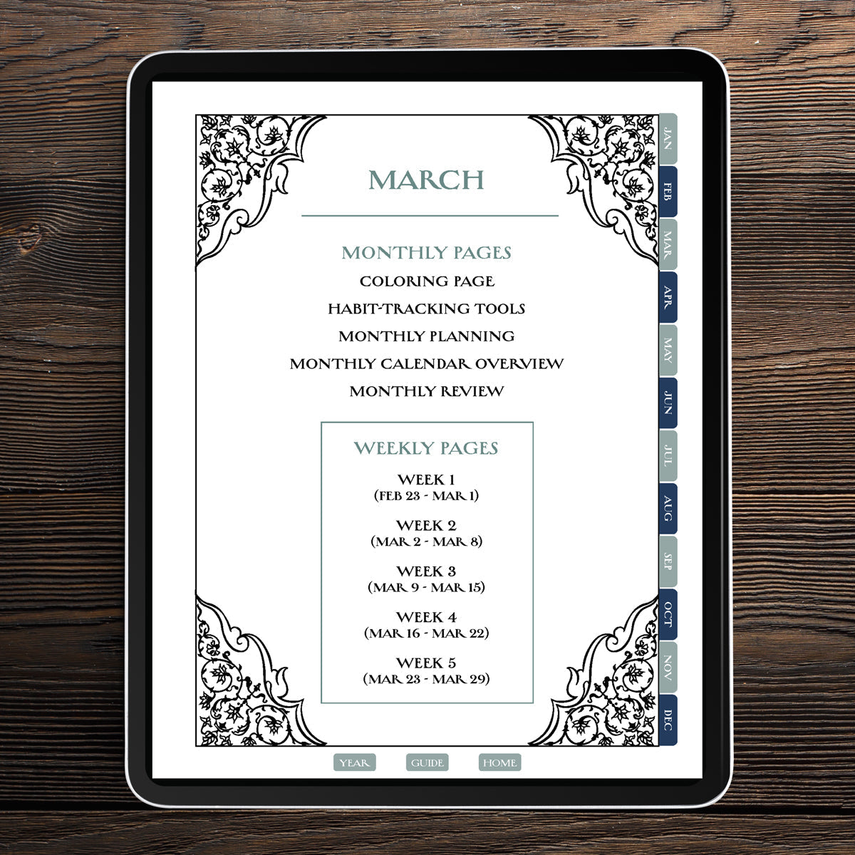 - Hyperlinked Navigation: Easily move between months using the monthly tabs located on every page or jump to the beginning of the planner, the instruction page, or the yearly index using the Home, Guide & Year buttons.