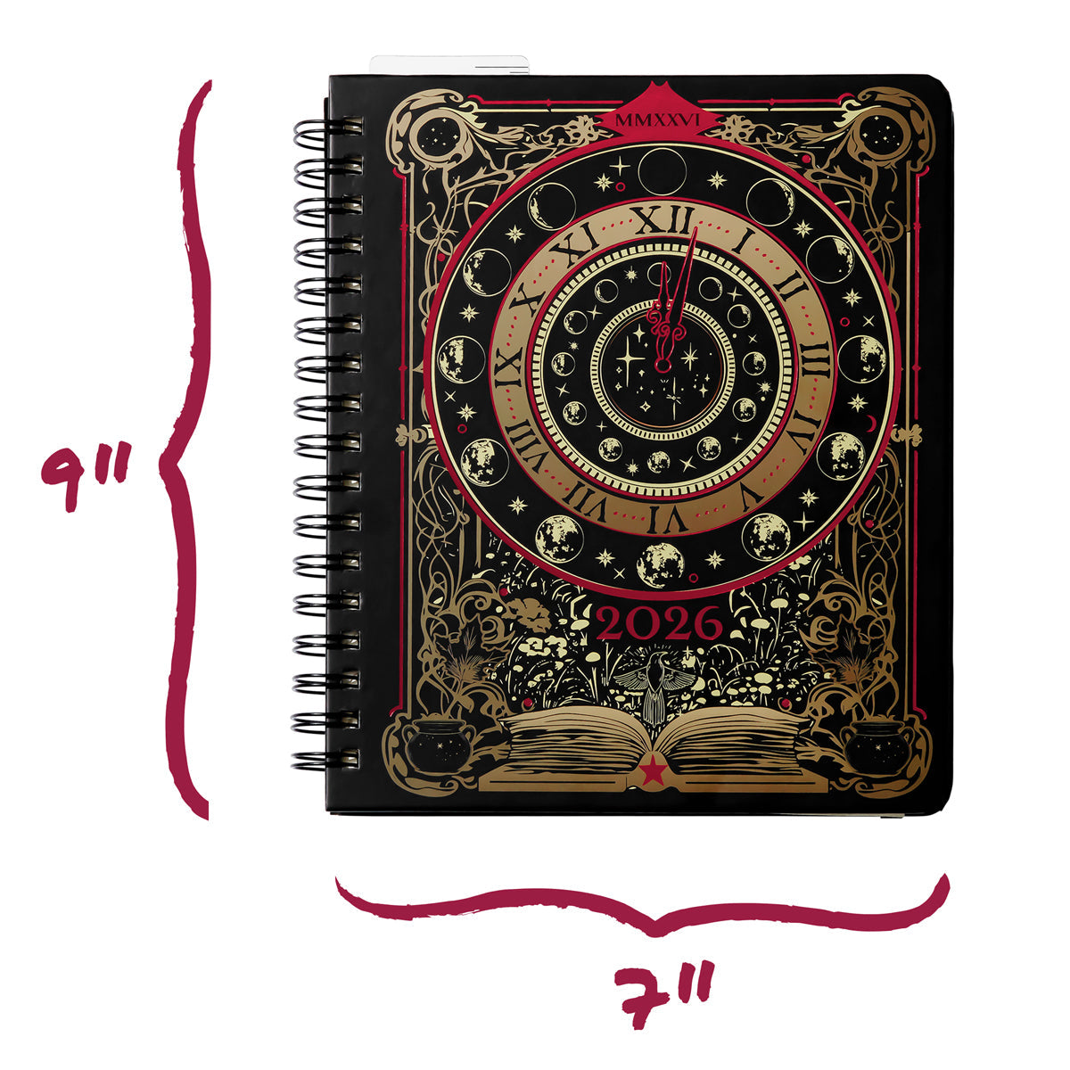 This 7'' x 9'' planner has 164 pages, a hardback cover with foil detailing, black spiral binding, an elastic strap, a storage pocket, and a ruler bookmark. Whether tracking your daily tasks, planning a trip, or recording your goals, the Waiting for the Night 2026 Planner drapes you in quiet mystery all year long. And don't forget to complete your year-round dark aesthetic with the coordinating 2026 Wall Calendar!