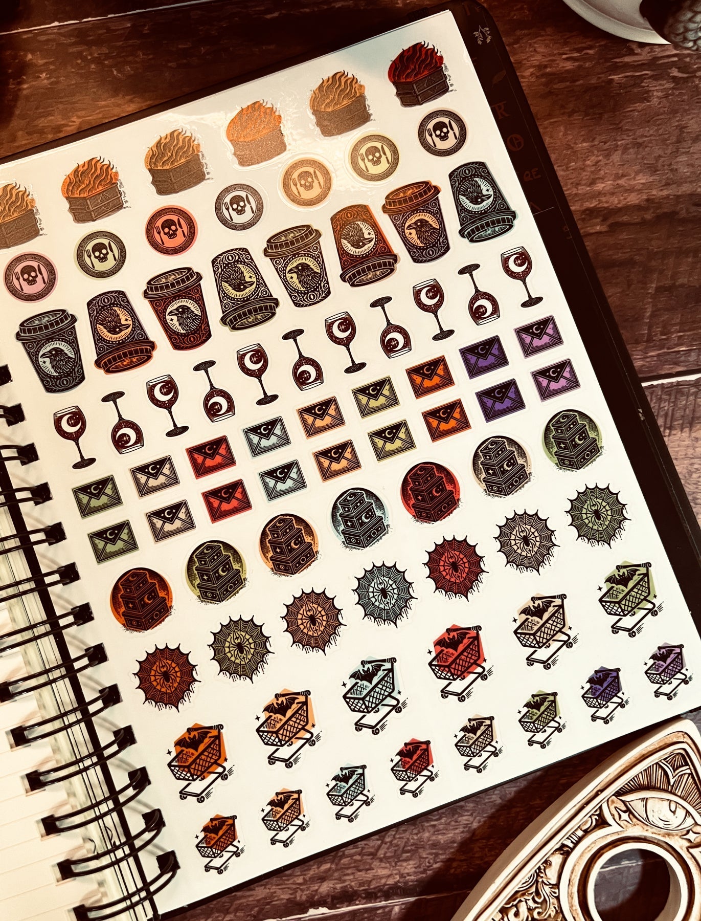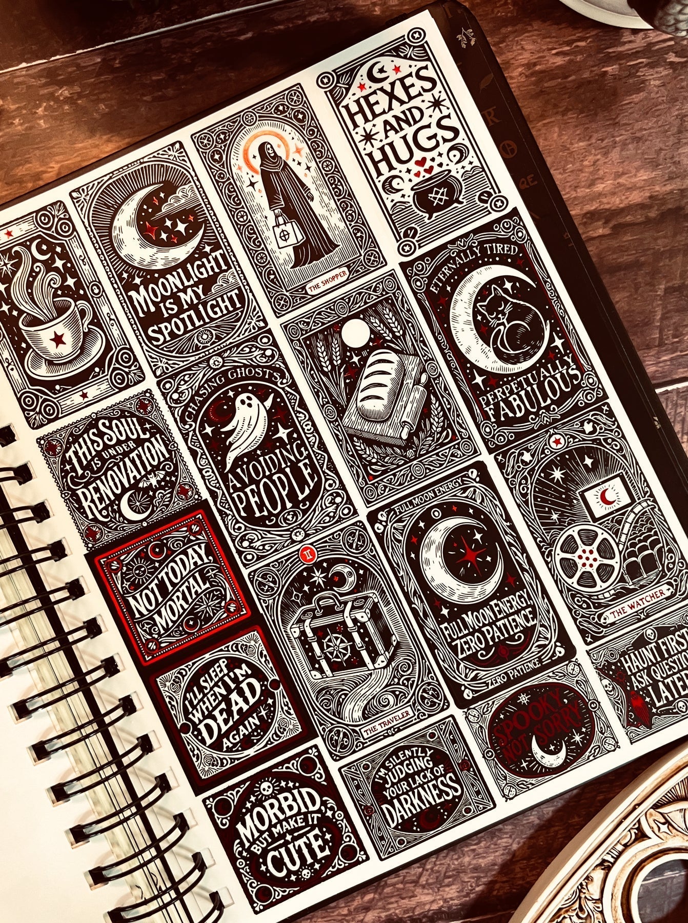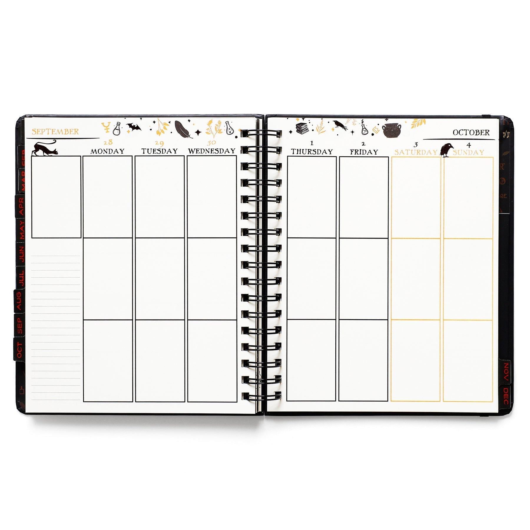 Inside, you'll find full monthly spreads and vertical weekly pages to plan your days, track your reads, plot your world domination. Each month features a unique tabbed page with tarot card-inspired artwork featuring crescent moons, spellbooks, dark florals, and other hauntingly magical designs. You'll also find moon phases, seasonal shifts, and holidays, along with four planner sticker sheets that feature hauntingly charming, bookish designs, and include weather symbol stickers and functional stickers to personalize your pages.