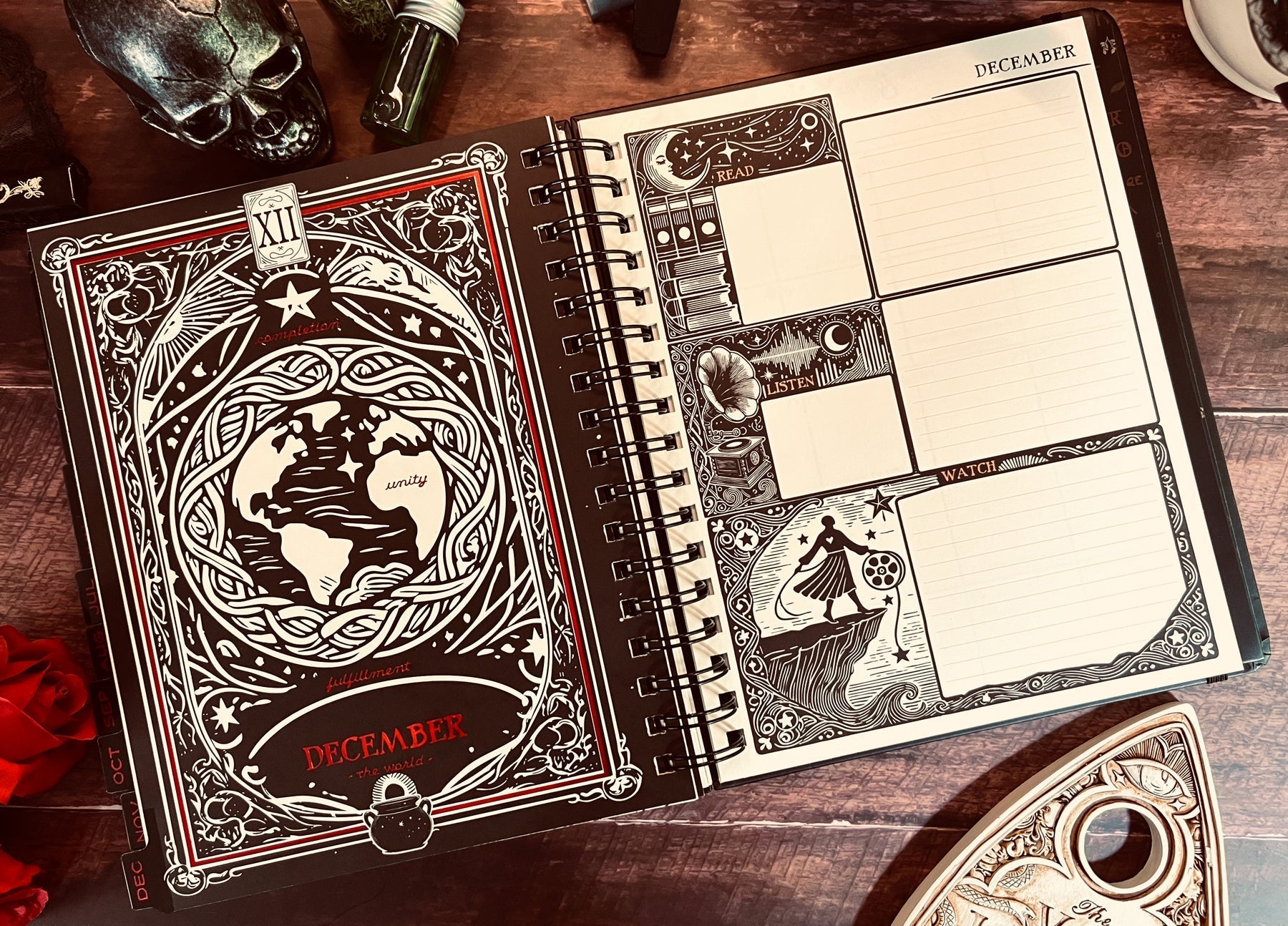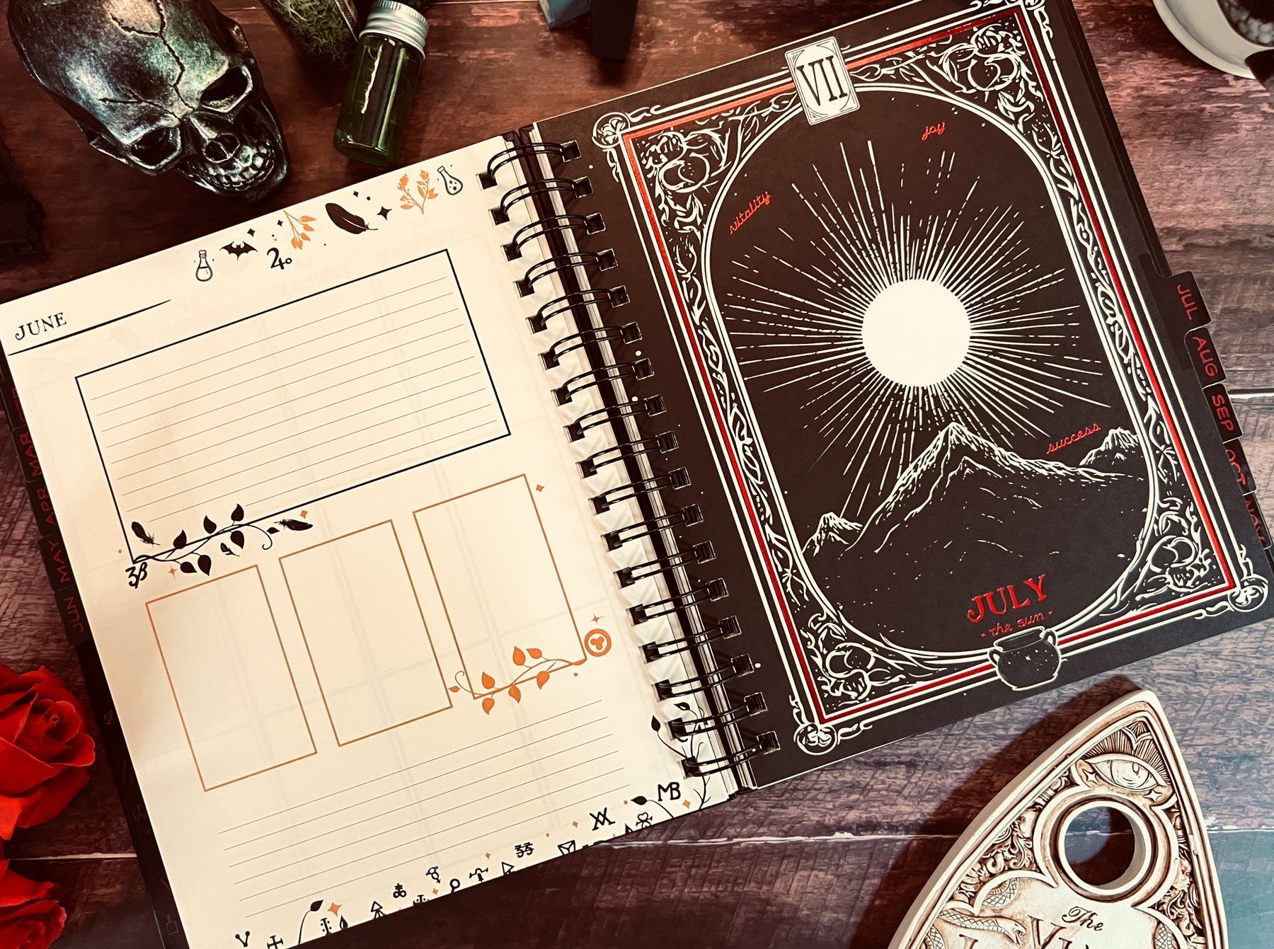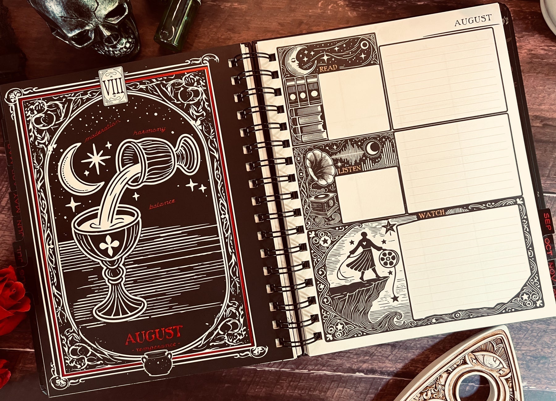 - Features 12 unique, monthly tabbed pages with tarot card-inspired designs